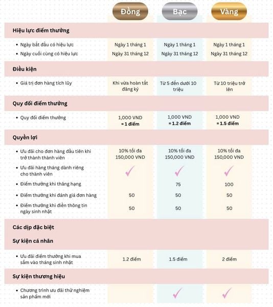 - Với mỗi 1,000 (VNĐ) chi tiêu tại website Murad, tùy vào phân hạng chi tiêu khách hàng sẽ nhận được: + Khách hàng hạng Đồng: 1,000 VNĐ = 1 điểm Murad. + Khách hàng hạng Bạc: 1,000 VNĐ = 1.2 điểm Murad + Khách hạng hạng Vàng: 1,000 VNĐ = 1.5 điểm Murad - Điểm thưởng chỉ được quy đổi thành mã giảm giá, quà tặng kèm và các quyền lợi khác của Murad. - Tất cả các ưu điểm chỉ được áp dụng duy nhất khi mua sắm tại Zalo Mini App của Murad Việt Nam - Sau khi đổi điểm tích lũy thành voucher/ưu đãi, điểm được coi là đã sử dụng, khách hàng không thể hoàn lại vào tài khoản thành viên. - Sau khi quy đổi điểm, việc lựa chọn quà tặng không được sửa đổi hoặc thay đổi.- Điểm và đặc quyền không thể chuyển nhượng và chỉ có thể sử dụng bởi thành viên. - Murad có quyền sửa đổi các điều khoản và điều kiện của chương trình hội viên mà không thông báo trước. 4. Các câu hỏi thường gặp 4.1. Làm sao để trở thành Thành viên Murad? Có 2 cách để trở thành thành viên của Murad: - Cách 1: Bạn chỉ cần đăng nhập mua hàng tại Website Murad Việt Nam, bạn sẽ tự động trở thành thành viên thân thiết của Murad Việt Nam. - Cách 2: Bạn chỉ cần đăng ký tại đây để trở thành thành viên thân thiết mà không phải mua hàng. 4.2. Có cần trả phí để trở thành thành viên Murad? Bạn hoàn toàn không phải trả bất cứ chi phí nào để trở thành thành viên của Murad. 4.3. Chương trình khách hàng thành viên được áp dụng ở đâu? Các ưu đãi trong chương trình ưu đãi thành viên chỉ được được áp dụng trên Zalo Mini App chính thức của Murad Việt Nam. 4.4. Làm sao tôi có thể nhận ưu đãi giàm 10% đơn hàng đầu tiên của thành viên thân thiết? Có 2 cách để bạn nhận ưu đãi: - Cách 1: Bạn vui lòng đăng ký thông tin tại đây để nhận được ưu đãi gửi về Zalo và sử dụng trên Zalo Mini App. - Cách 2: Bạn có thể nhắn tin tới Zalo OA Murad Việt Nam để đội ngũ CSKH hỗ trợ đăng ký và sử dụng ưu đãi cho bạn. 4.5. Đối tượng đủ điều kiện nhận ưu đãi giảm 10% đơn hàng đầu tiên của thành viên thân thiết? Áp dụng với mọi khách hàng mua hàng lần đầu tính từ ngày khởi động chương trình 1/9/2024. Mọi thắc mắc liên quan đến Chương trình thành viên, bạn vui lòng để lại tin nhắn cho Fanpage Murad Việt Nam. 4.6. Điểm tích lũy Murad là gì? - Điểm tích lũy Murad là điểm bạn có được sau khi thực hiện thành công đơn hàng của Murad tại website, Zalo và trang Fanpage Murad Việt Nam. - Mỗi 1,000 VNĐ chi tiêu trên giá trị đơn hàng sau chiết khấu của bạn sẽ tương đương 1 điểm tích lũy Murad. - Điểm tích lũy là căn cứ để nâng hạng thành viên Bạc(Silver) - Vàng(Gold) - Kim cương(Diamond), để tận hưởng những ưu đãi độc quyền của từng bậc thành viên. - Ngoài ra, điểm tích lũy còn có thể nhận được khi tham gia các hoạt động tương tác với Murad như đánh giá đơn hàng, theo dõi mạng xã hội (Zalo OA) và các dịp đặc biệt như lễ và sinh nhật. Lưu ý: - Điểm tích lũy sẽ được cộng vào tài khoản của bạn mỗi khi đơn hàng của bạn được giao thành công. 4.7. Làm sao để sử dụng điểm tích lũy? Điểm tích lũy chỉ được sử dụng khi mua hàng trên Zalo Mini App của Murad Việt Nam. Khách hàng thực hiện thao tác như sau: Vào Mini app → Trang chủ → Chọn đổi thưởng → Đổi điểm tương đương voucher → Vào Ưu đãi của tôi → Lấy mã đó áp vào đơn hàng.